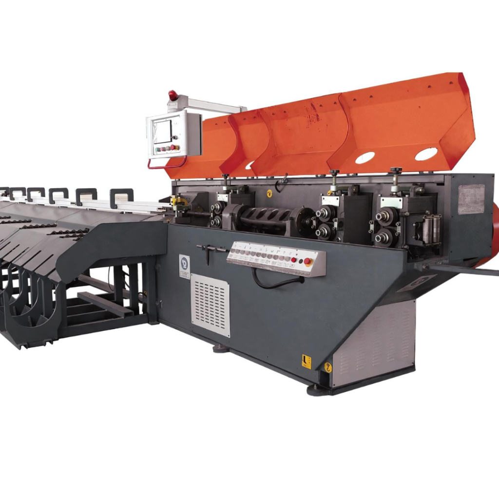 Endireitadeira Automática de alta velocidade por fieira rotativa para a produção barras cortadas sob medida, utilizando aço CA50/60 em bobina com diâmetro de até ø12,7mm. Sistema de arraste e corte feitos por servomotores, com programação através de painel CLP e regulagem por fim de curso.