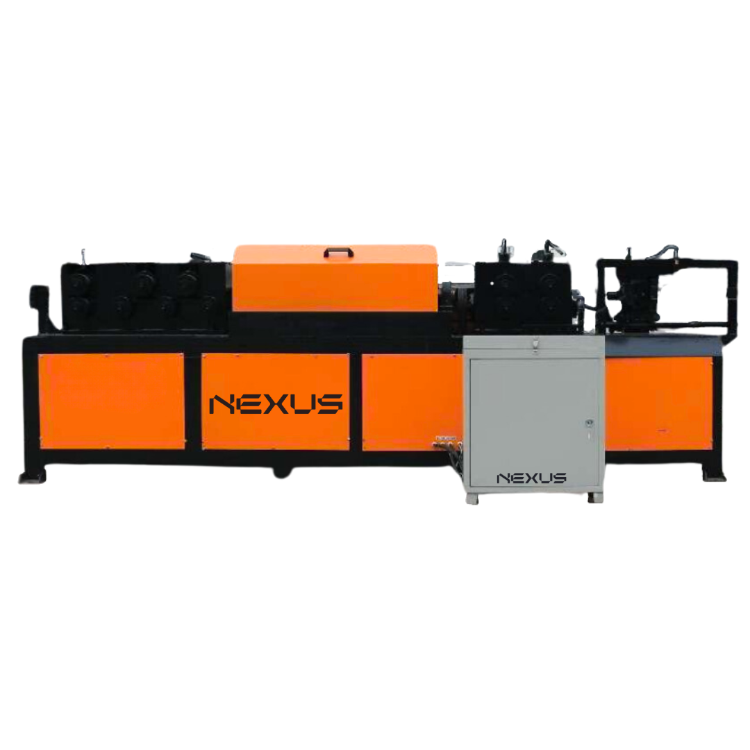 Endireitadeira Automática por roletes hiperbólicos, para a produção barras cortadas sob medida, utilizando aço CA50/60 em bobina com diâmetro de até ø20mm. Sistema de arraste através de motofreio, corte por sistema hidráulico e com programação total através de painel CLP.